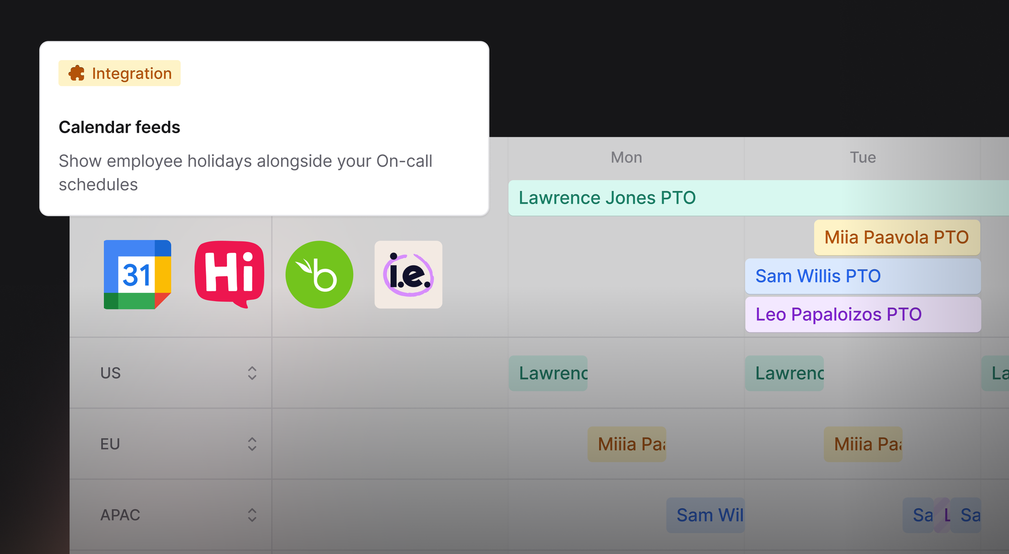 You can easily bring in all personal holidays for your organization or part of your organization by connecting us to your HR system or Google Calendar. You just have do it once and it will automatically apply to all your schedules. Once you’ve integrated, you’ll be able to view relevant holidays for your team members in their On-call schedules.