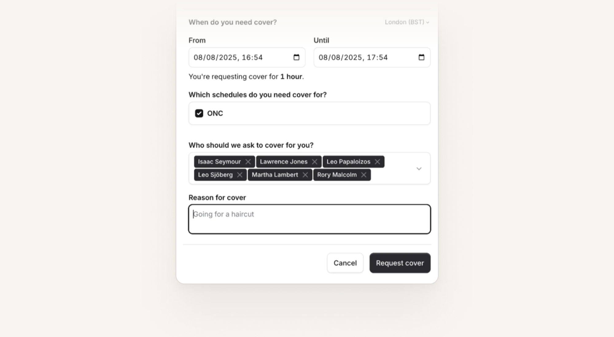 Previously, when asking for a cover request, we'd default to asking everyone on your schedule. However, this could sometimes be quite limiting as you might want to ask folks outside of your team, or remove anyone that might be on holiday.
