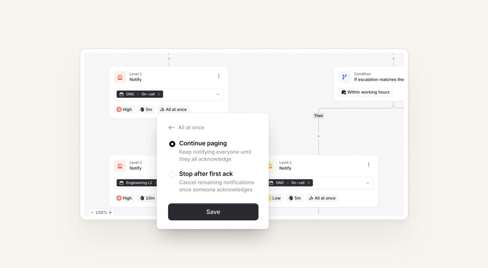 You can now choose what should happen once someone acknowledges an escalation, if multiple people have been paged. Previously, we'd keep notifying anyone who'd already been notified until they acknowledged. Now, you have the option to cancel any further notifications for anyone else, even if they've already been paged.