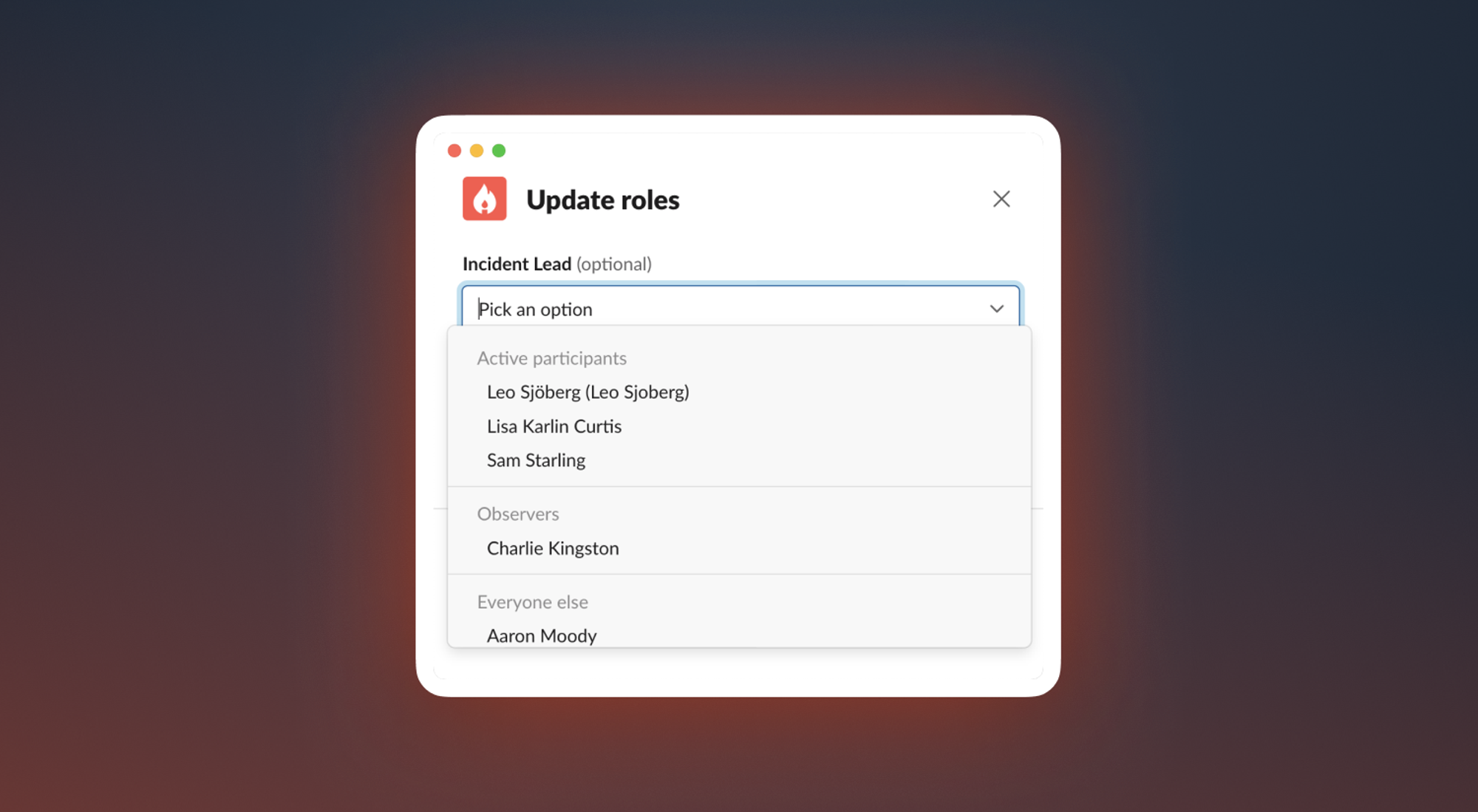 When you’re in an incident, if you’re assigning roles, actions or follow-ups, you usually want to assign it to someone who’s already been involved in the incident. We now group the relevant drop-downs in Slack and in the dashboard so that we prioritise the folks that are in the incident (active first, then observers, then everyone else).