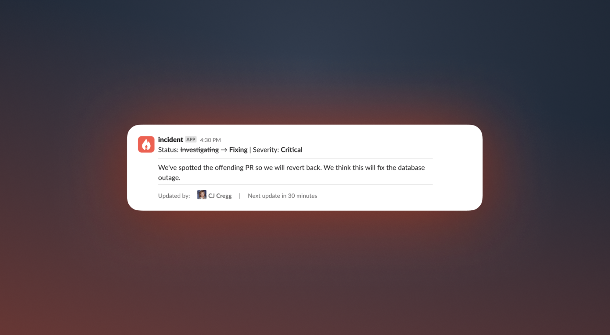 Now, these messages all have the same layout of information to make them easier to parse. We’ve moved buttons and extraneous links to the overflow menu, and we’ve added Slack avatars to highlight who made the incident update.