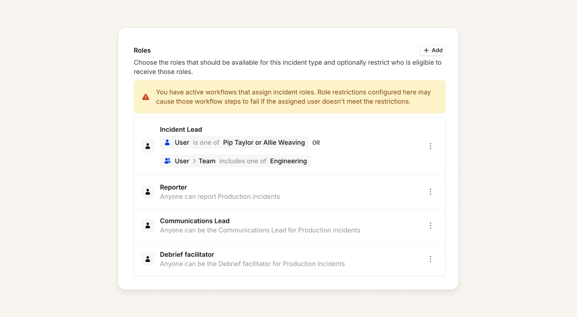 Organizations can now set restrictions on incident roles based on incident type. This can be helpful if you need to ensure certain incident steps are done in a certain way, so should only be done by those trained and know the correct procedures to follow.
