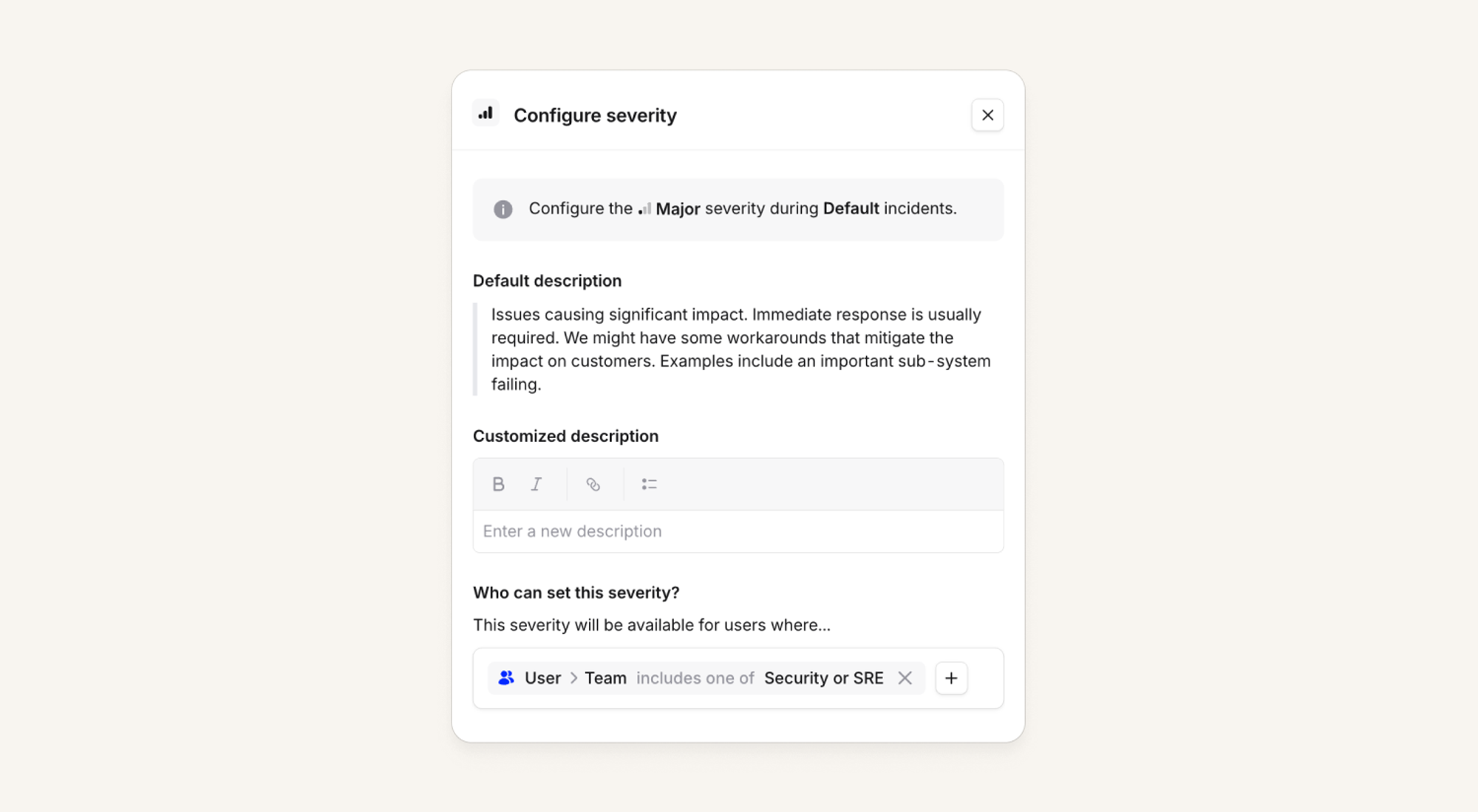 In addition to restricting what incident roles can do within an incident, we’ve released the ability to restrict who can set particular incident severities. For example, organizations can now say only the incident management team can set Production incidents to a Critical severity.