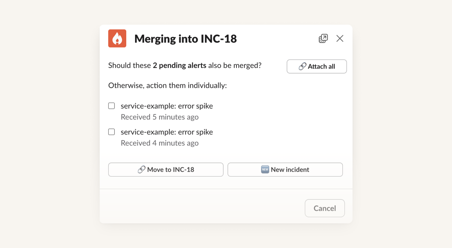 Now, as part of merging, we'll ask what you want to do with these existing alerts, giving you the option to include them into the merged incident. We've also added a handy "Attach all" button, as previously you had to click through each alert and mark it as related.