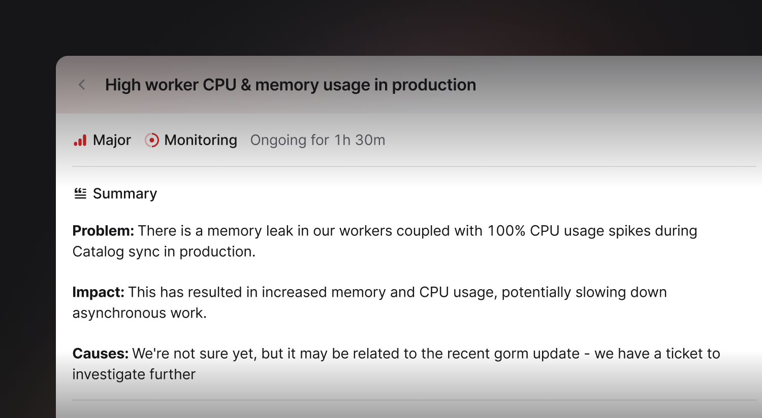 Incident summaries are not only a great way for responders to gain context on an issue but are also an important way for observers to follow along with what’s happening.