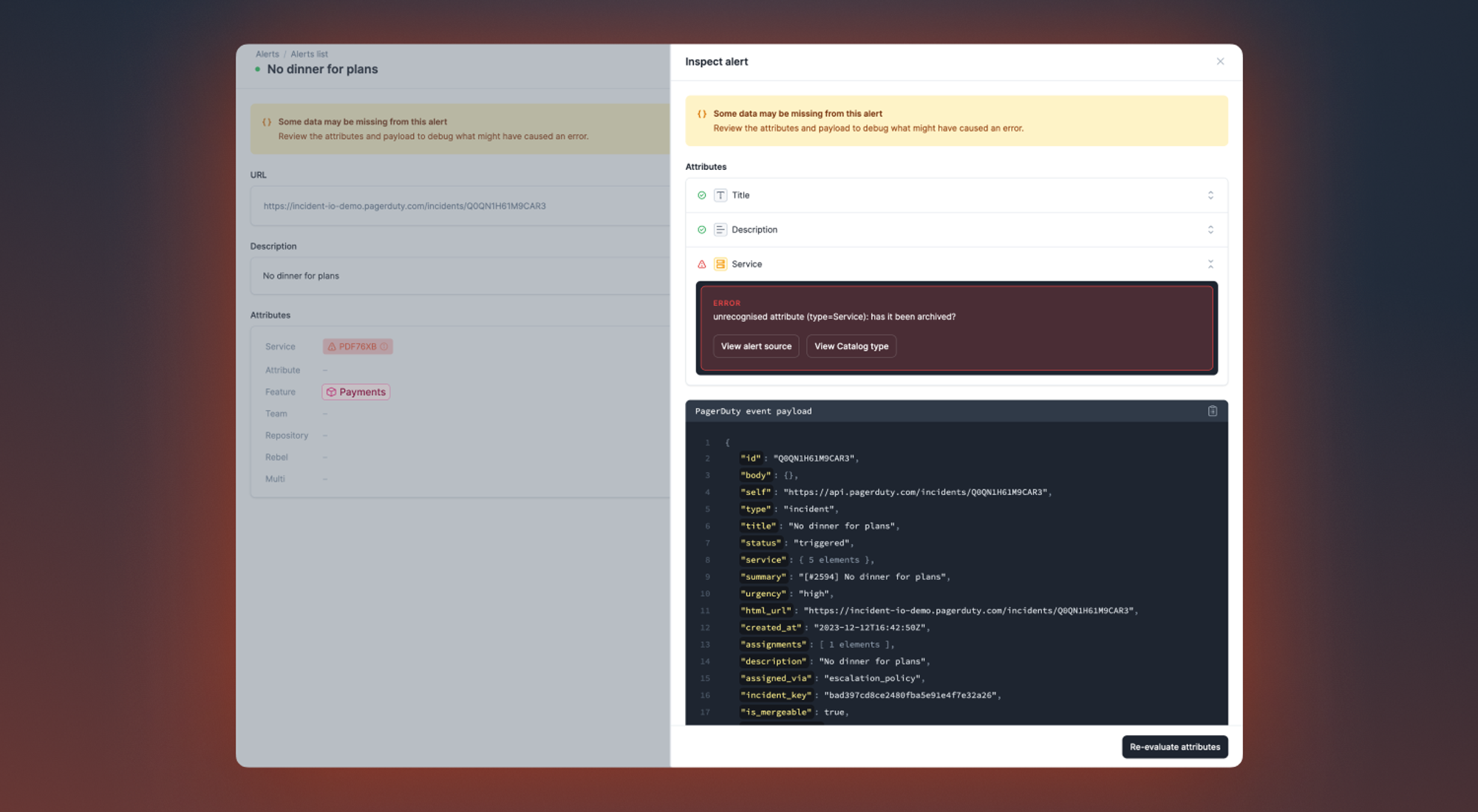 Most importantly, if you have noticed one of your alerts isn’t looking as it should (i.e. there is a missing attribute), you can use this inspector to determine the cause of a failure. For example, if we failed to parse an attribute because you changed its type in the catalog, you can now determine that without having to reach out to the incident.io team.