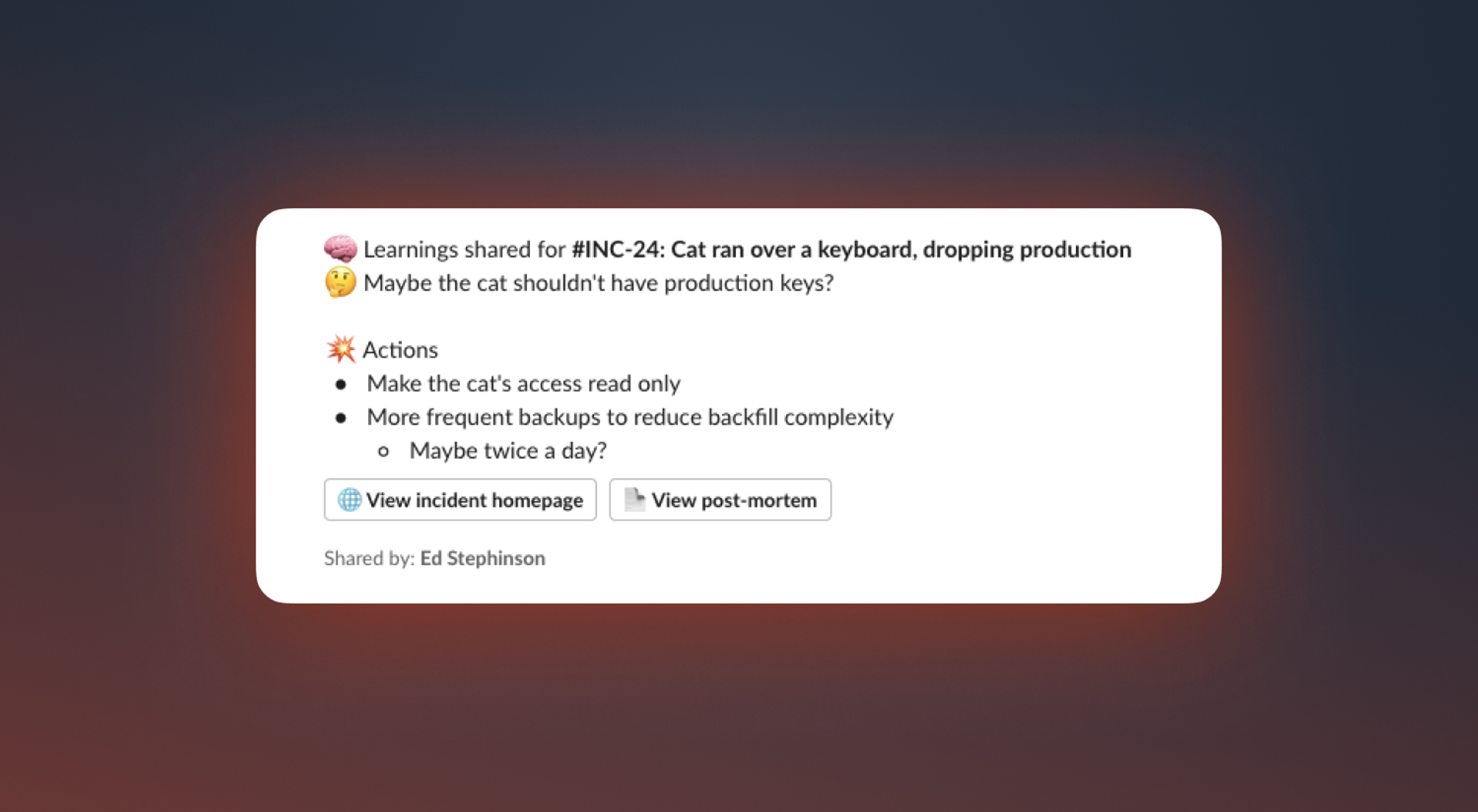 We recently added the ability to link incidents together from the dashboard. Now, you can do the same via Slack! Try /inc related to give it a go.