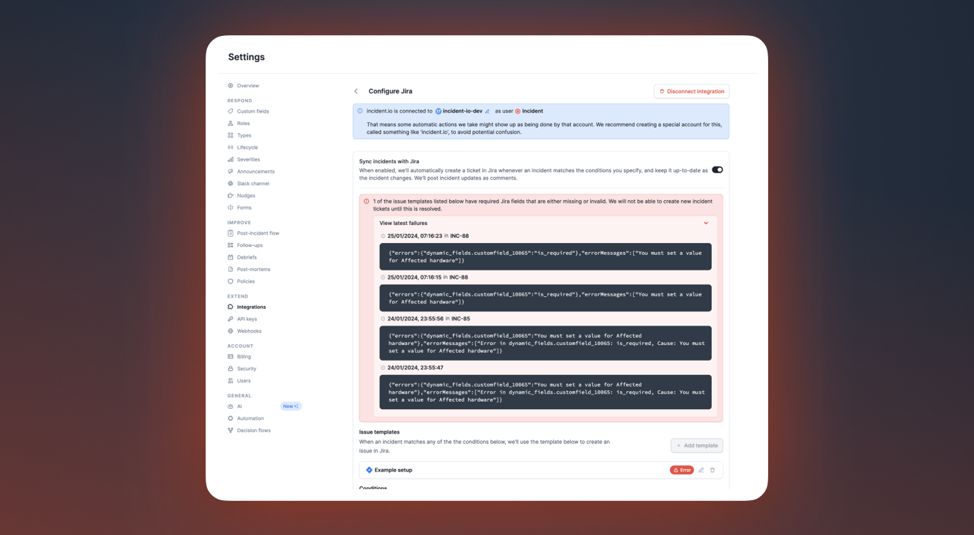 Jira integration error logs