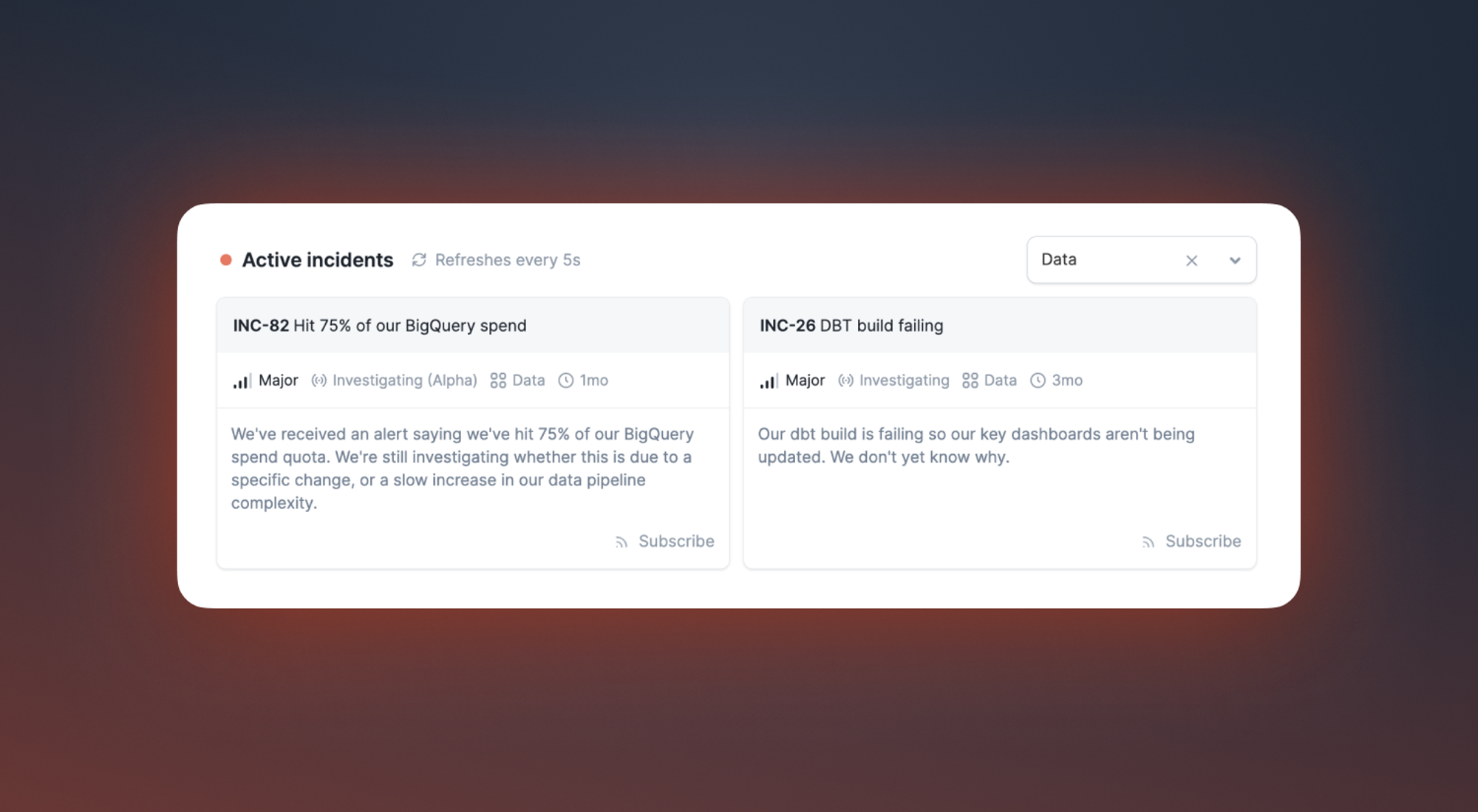 You can now filter your active incidents list to include incidents of a specific type. This means that if you’re running a morning standup on the Data team, you can quickly see if you’ve got any active data incidents.