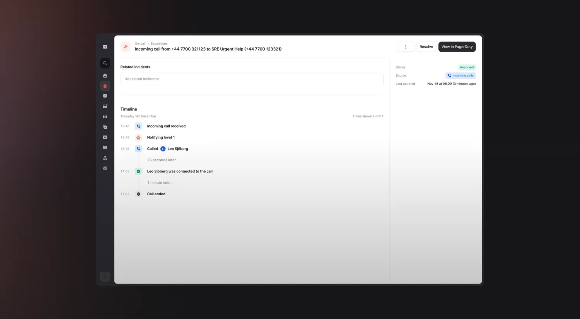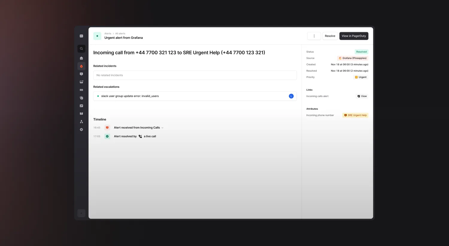 Incoming calls also create alerts, which you can connect to an alert route. This allows you to automatically create an incident when a call is received, which can be a useful place to coordinate, or for the on-caller to take notes from the call.
