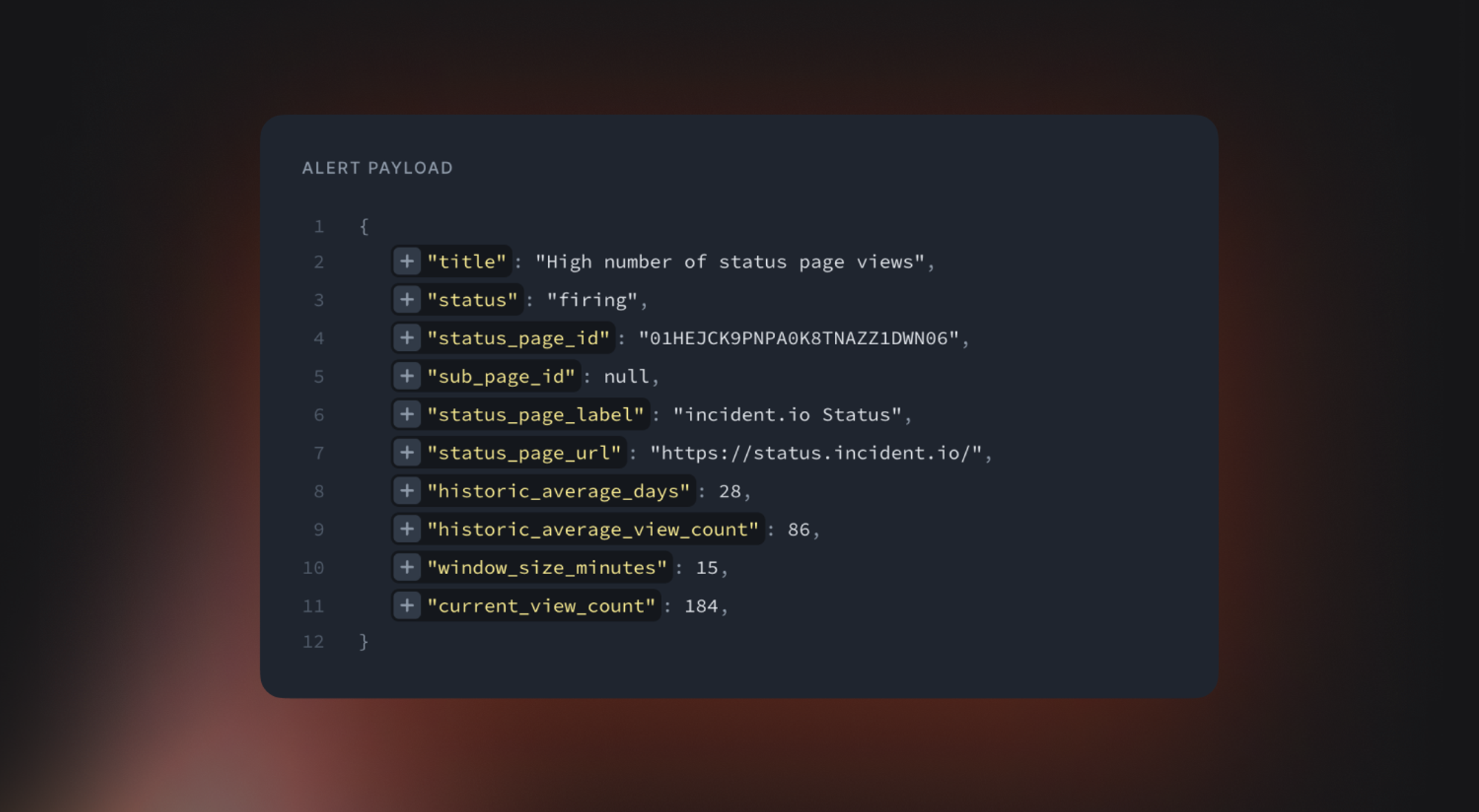 With our view spikes alert source we’ll open an incident whenever we detect that your incident.io status page is receiving higher views than it normally would in a short time window.