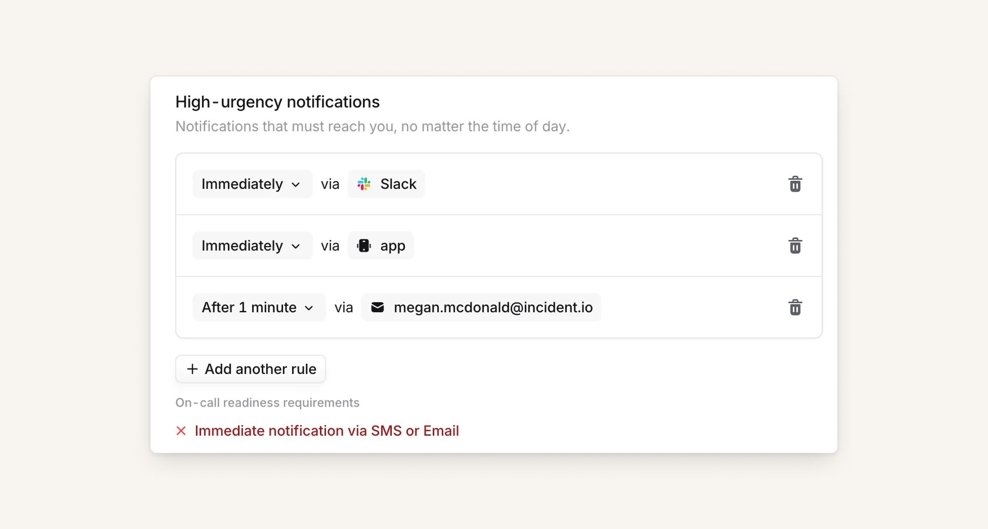 Organizations can now leverage our new on-call notification policies to enforce generic (or specific!) notification rules for employees, ensuring they are properly ready to be on-call. For example, you can specify that all your on-call teams have to use mobile app, voice and SMS notifications within 5 minutes. That way, you can avoid long delays until someone is properly woken up about an issue.