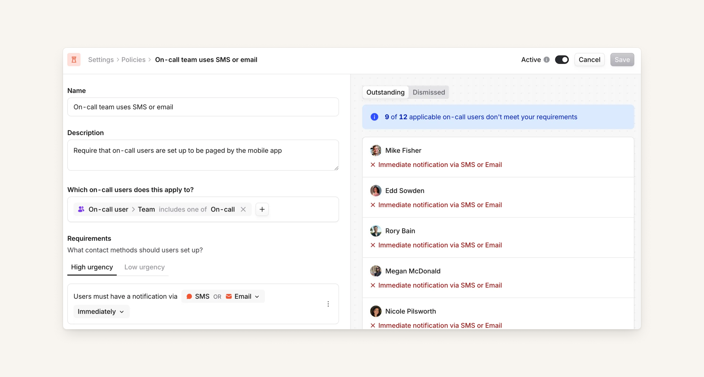 Once your policy is active and an on-call user is on a schedule or escalation path, they will be notified of any non-compliant notification set-ups via Slack, email and the home page timeline panel.