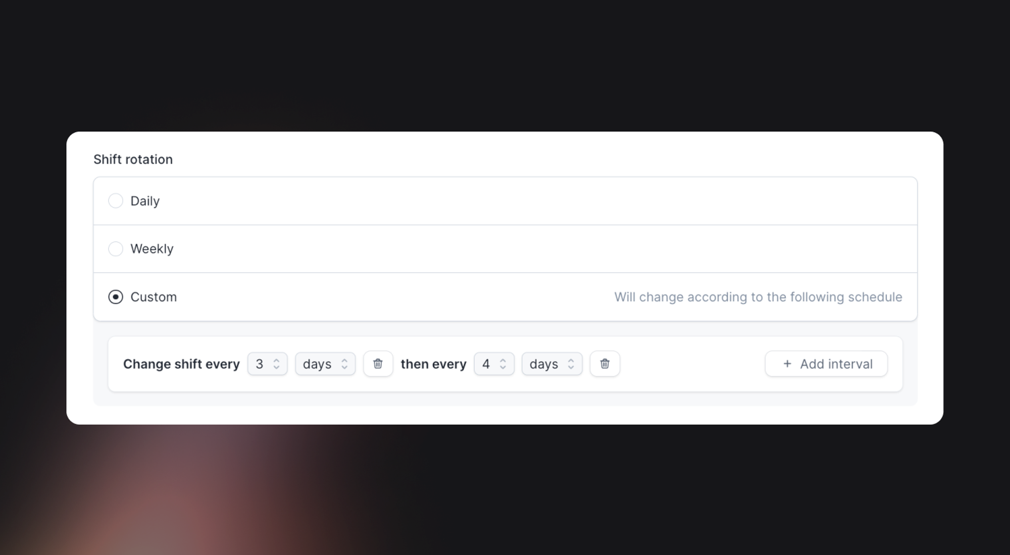 2️⃣ Build asymmetric rotations with multiple intervals (i.e. 3 days then 4 days -shifts)