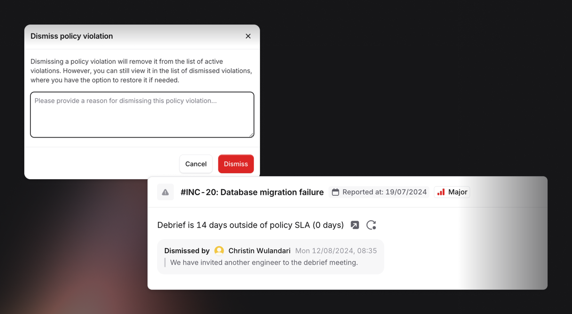 With this update, you can now dismiss these policy violations and provide a reason why. This keeps your dashboard focused on what really matters.