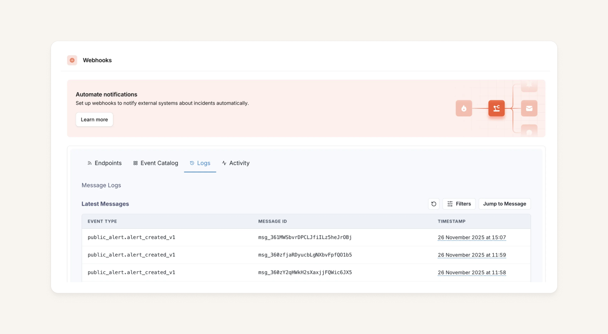Customers can now receive webhooks on new alerts being triggered when public_alert.alert_created_v1 events are selected within our webhook setup. This can be helpful if you need to send alert statuses from incident.io to your internal systems.
