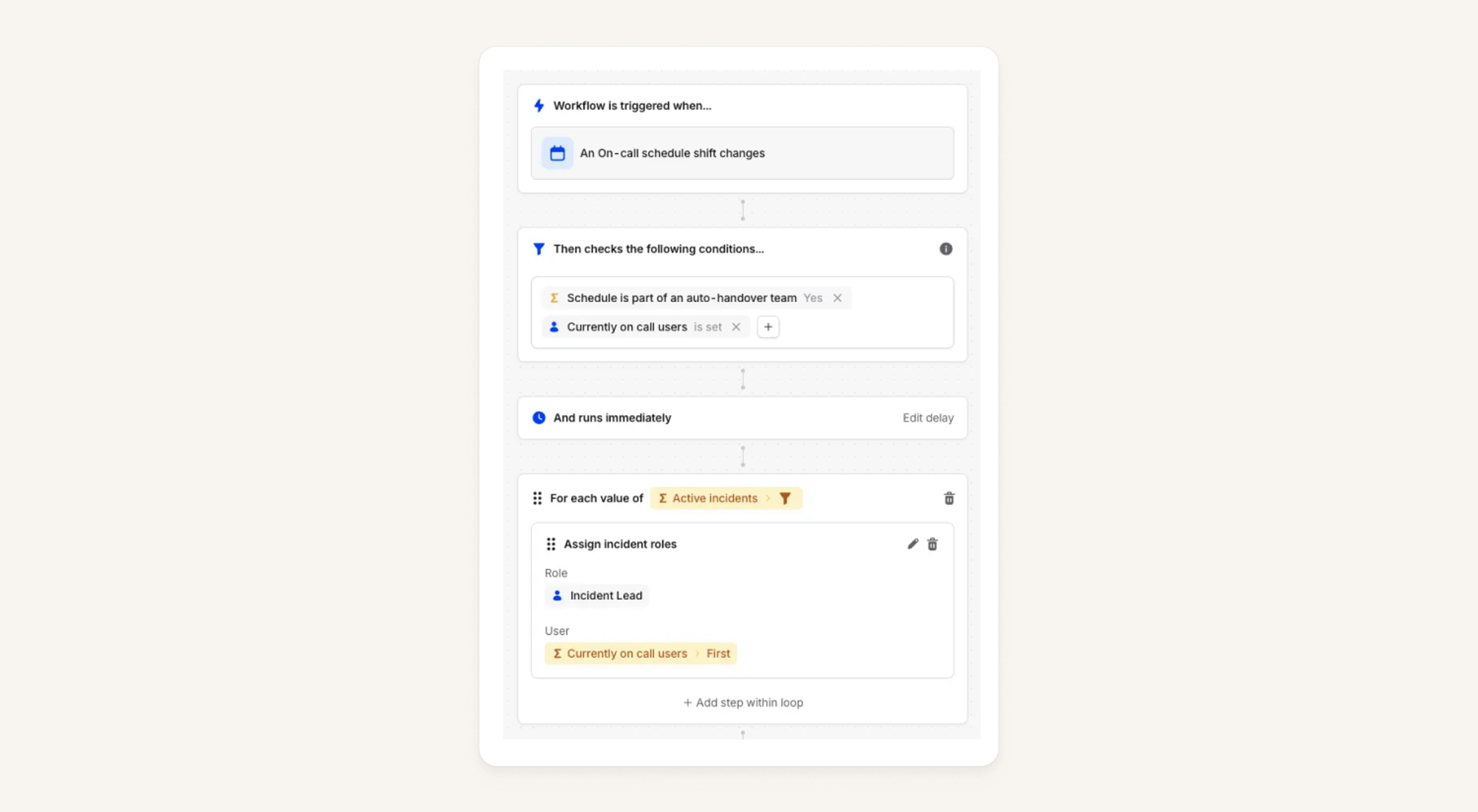 The "when an on-call shift changes" workflow trigger now lets you run workflow steps on active/triage incidents. This enables use cases like: when someone's on-call shift ends, reassign any incidents they are leading to the person coming on-call.