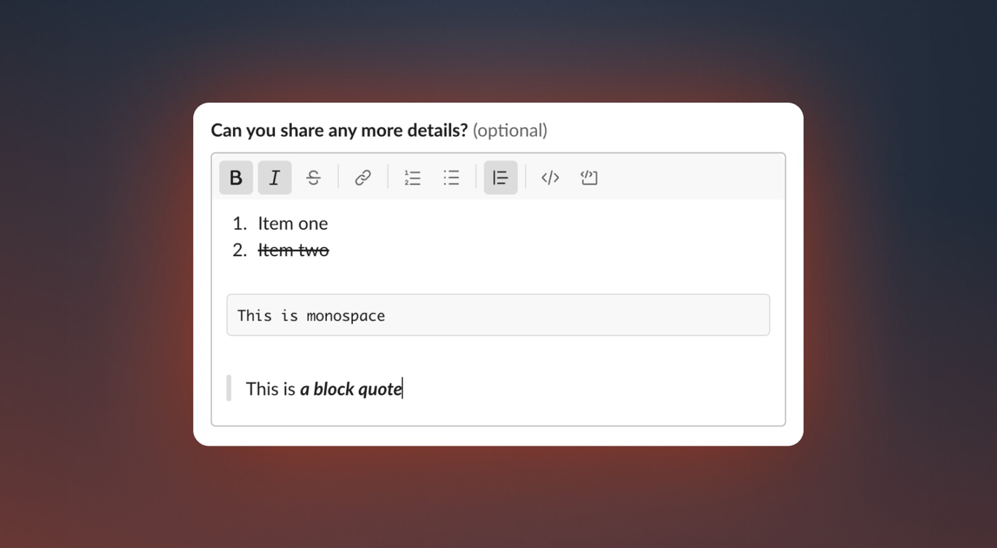 In Slack you can now use the same rich text editor that you use for composing messages to write summaries and updates.