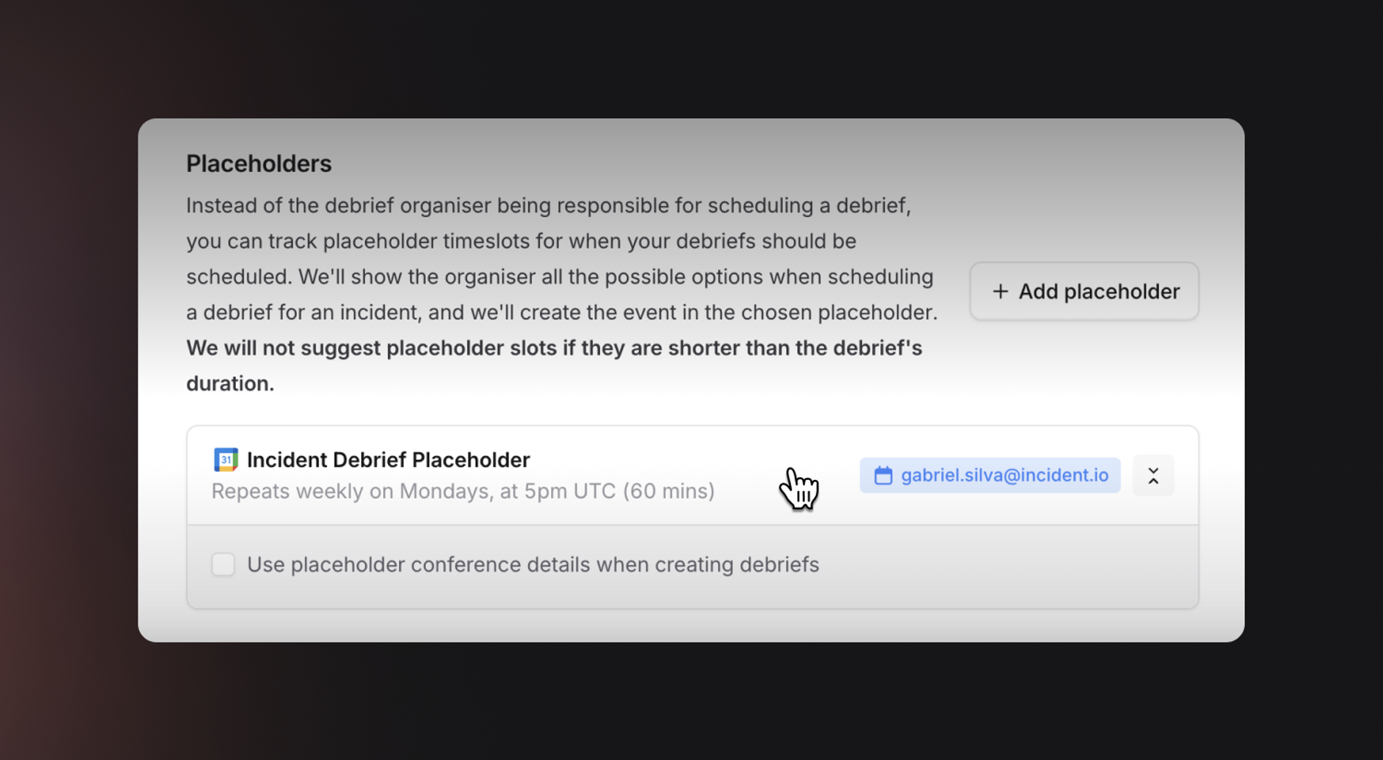 If you’re scheduling your debriefs with Google Calendar, you can now configure placeholders to specify whether debriefs created within a placeholder should reuse the placeholder's conference details.