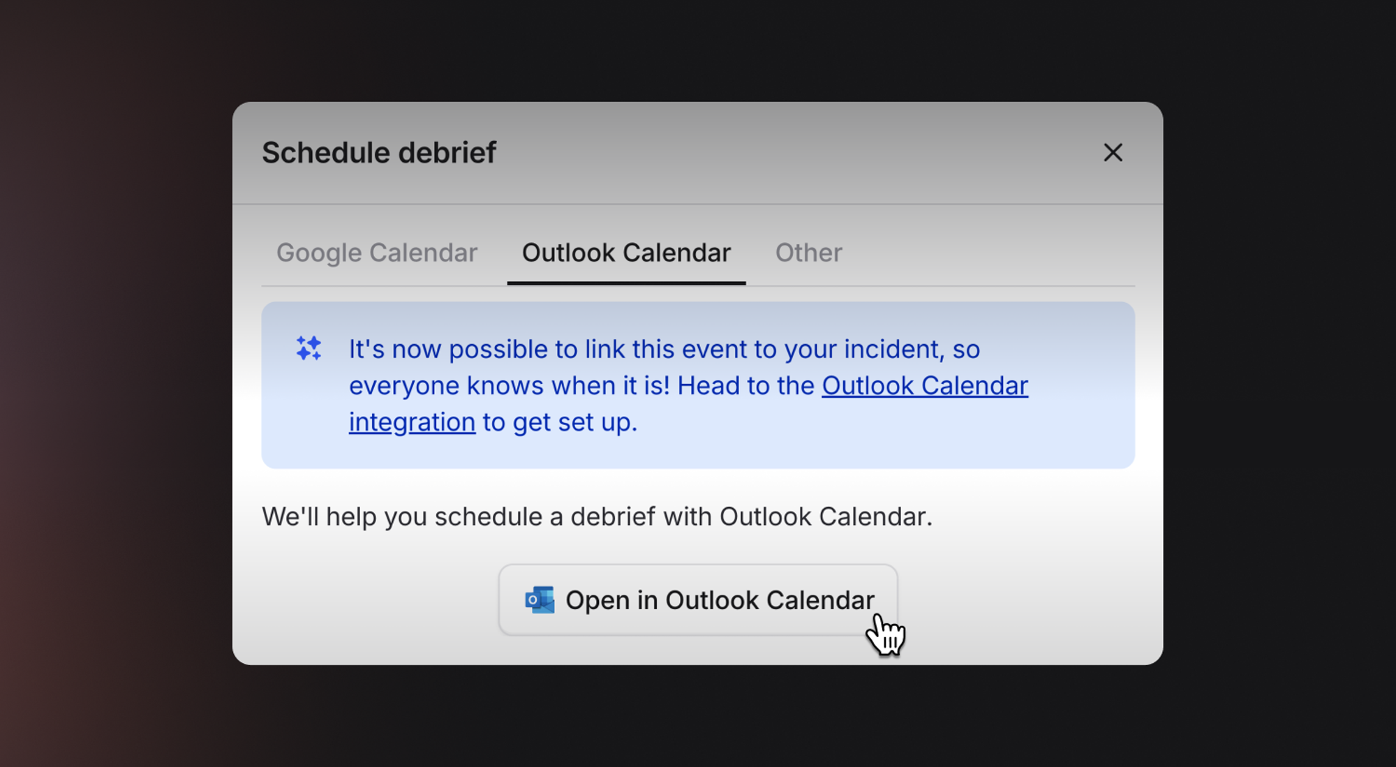 We've supported automatically linking debrief events with your Google Calendar for over a year, and now we're excited to announce Outlook Calendar support! You can link a debrief event to your incident directly from Outlook, ensuring everyone knows the timing and attendees.