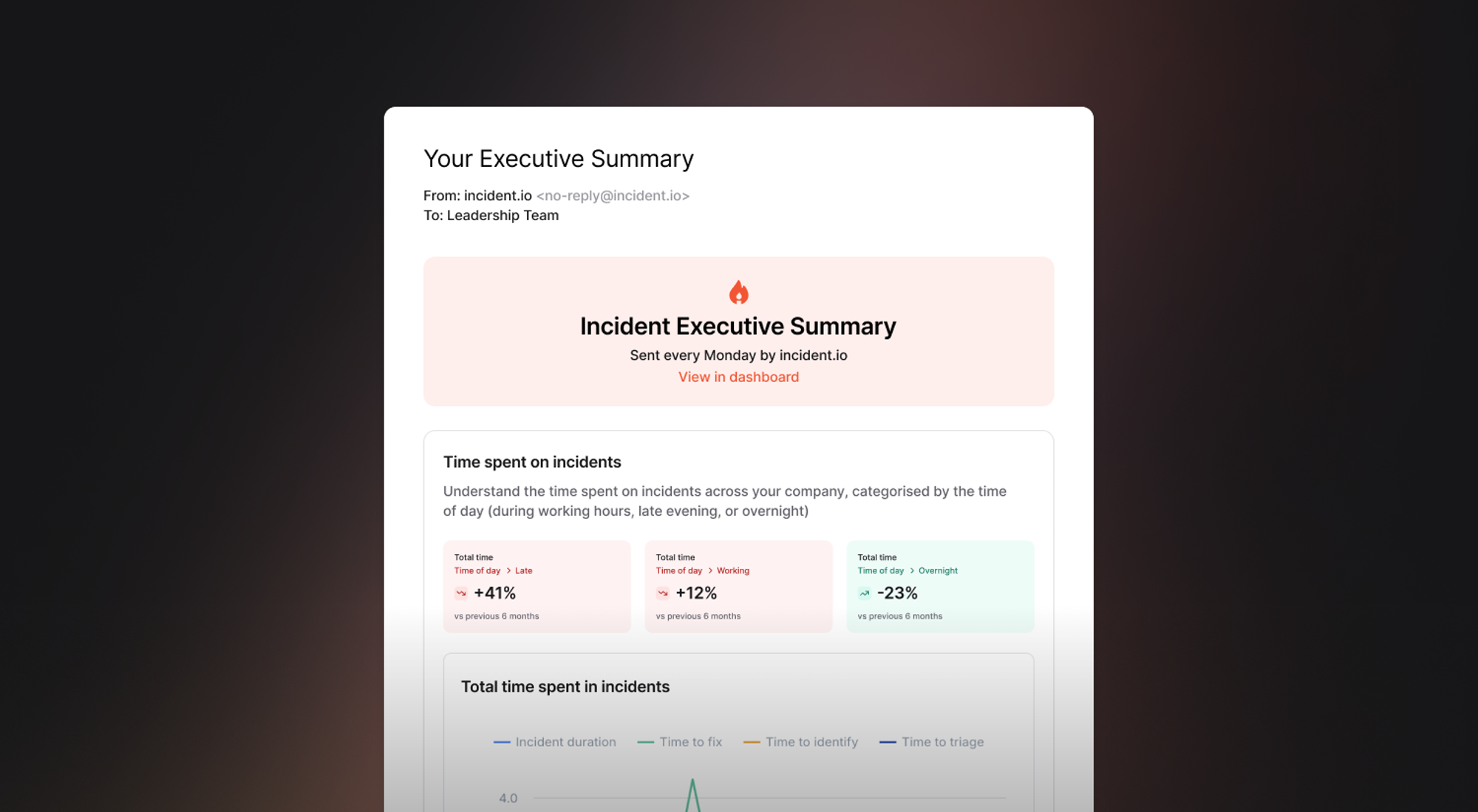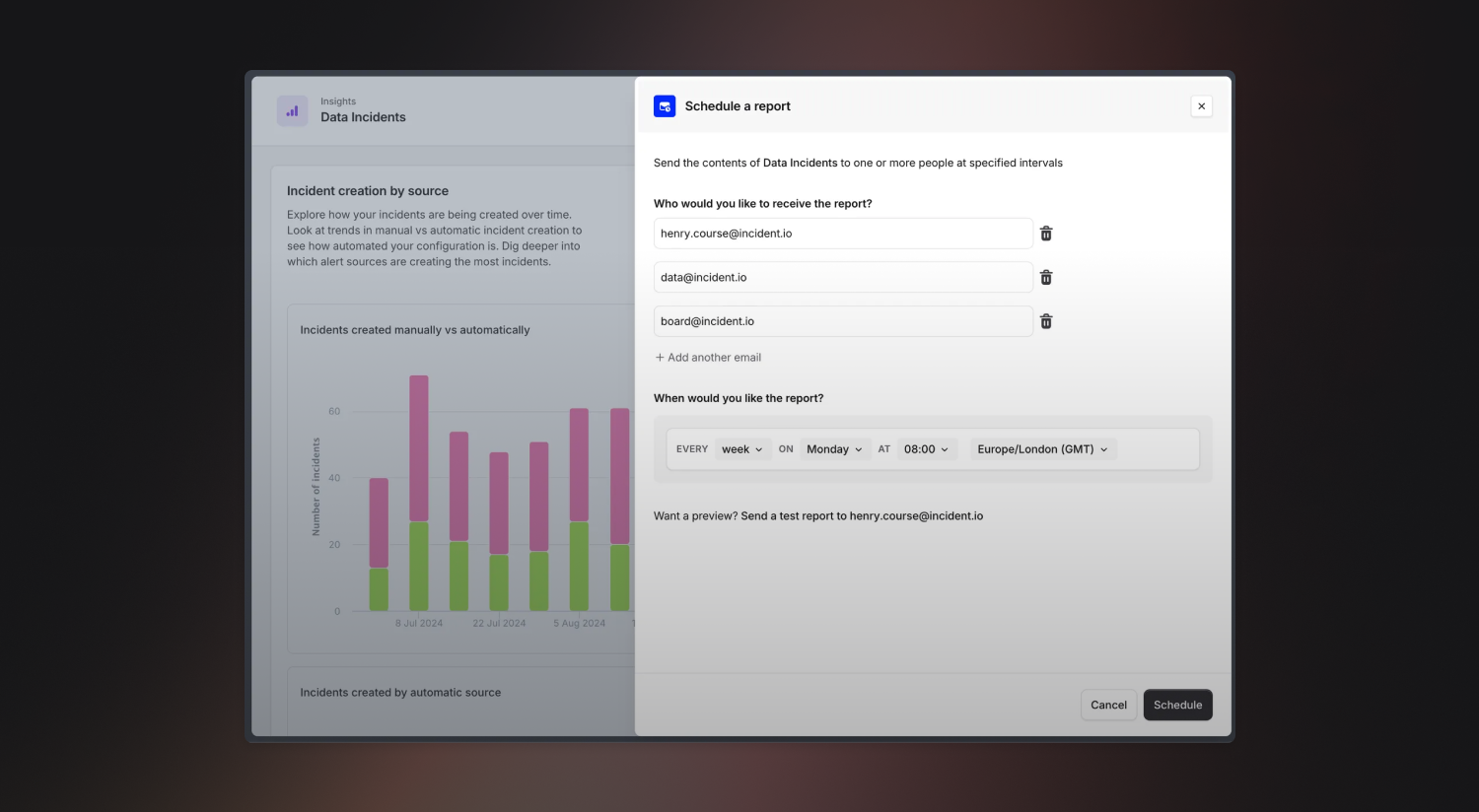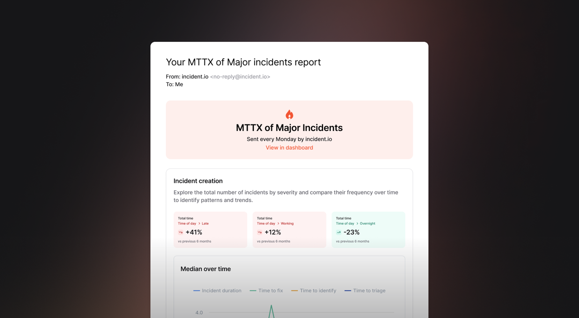 With scheduled reports, you can create a monthly executive summary to send MTTX metrics to the C-suite or see how much time your team is spending on incidents in your inbox every week. This helps you stay on top of alert noise, track team productivity, and see how your incident response processes are improving.