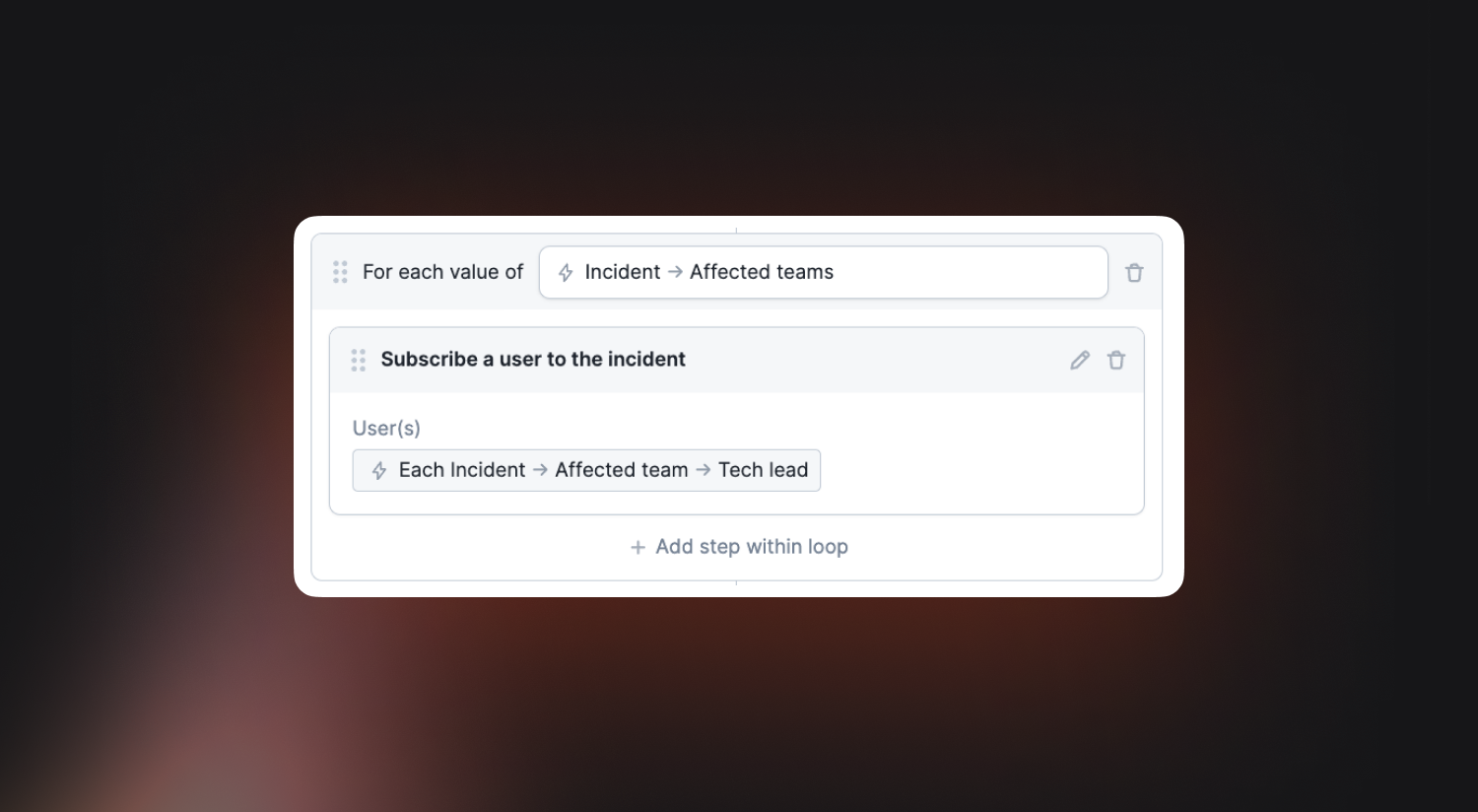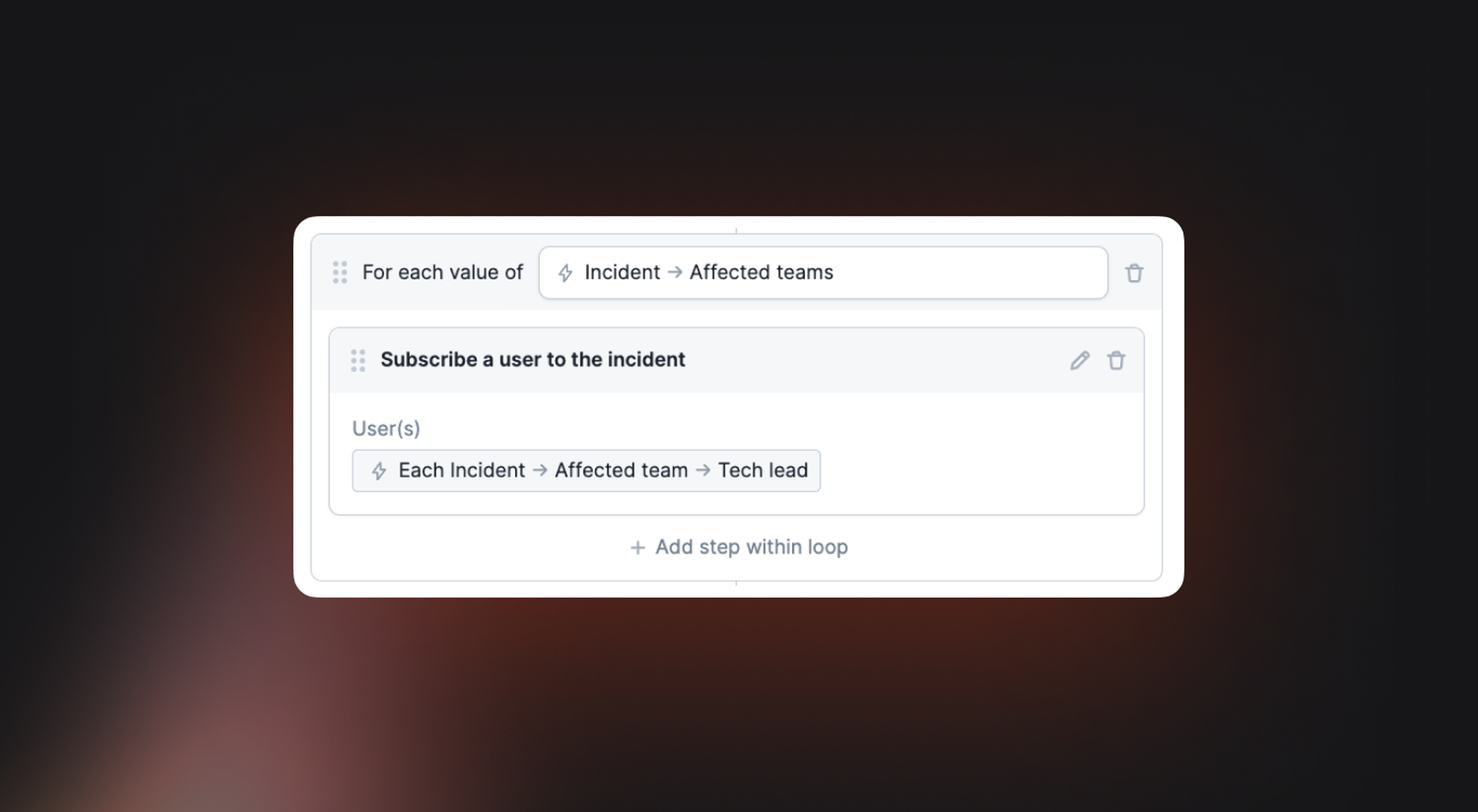 Now you can subscribe other users to incidents based on conditions within your workflow, like this example where we will always subscribe the tech leads of the affected teams.
