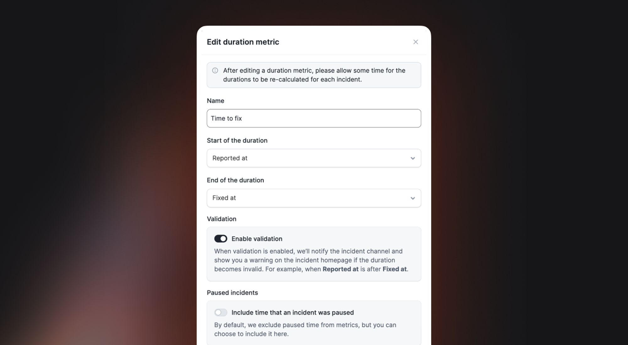 By default, any time that an incident spends paused is not included in your duration metrics. However, you might want to include this time in a particular metric if you’re interested in the total elapsed time (e.g. from a customer perspective) rather than the time spent working actively on the incident.