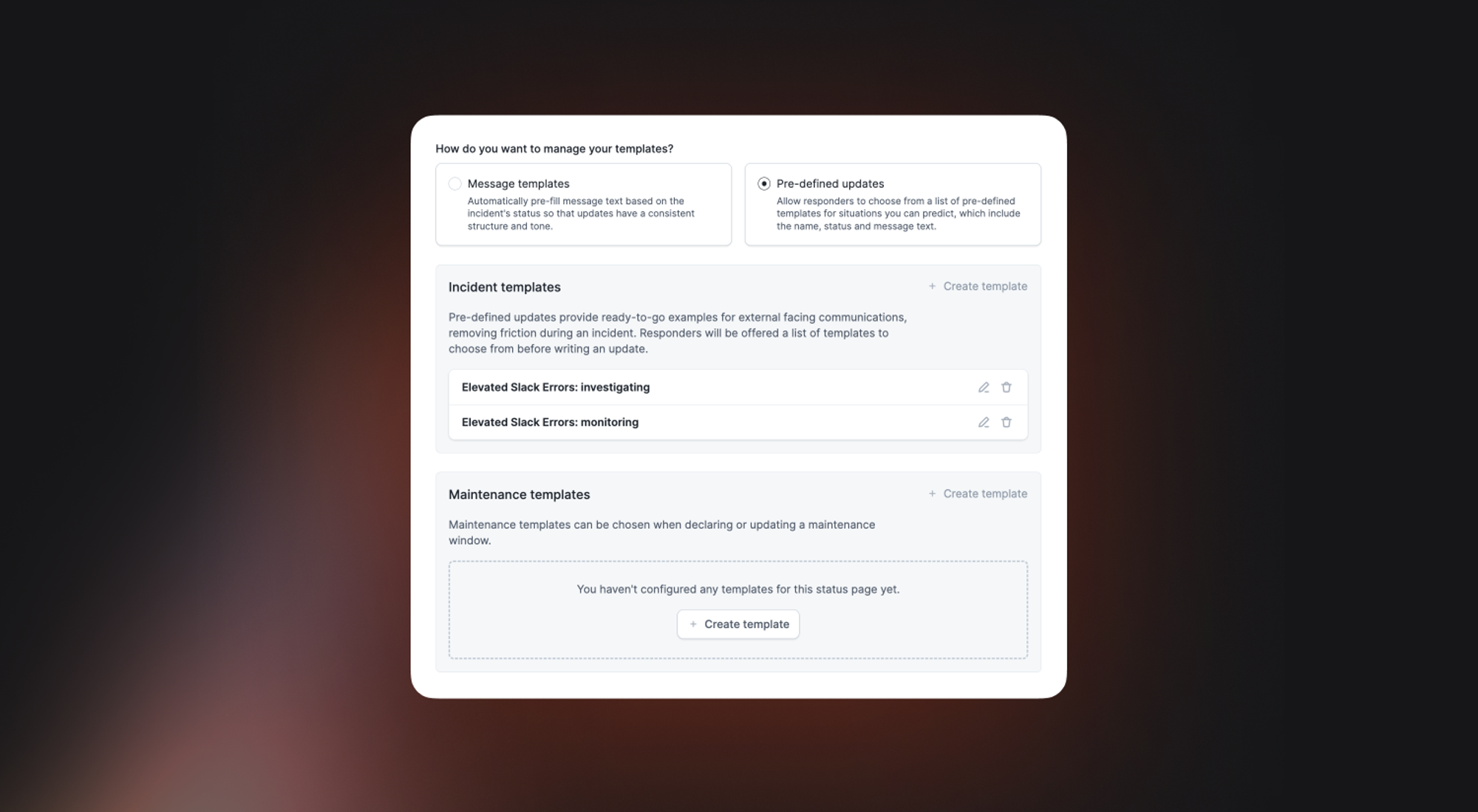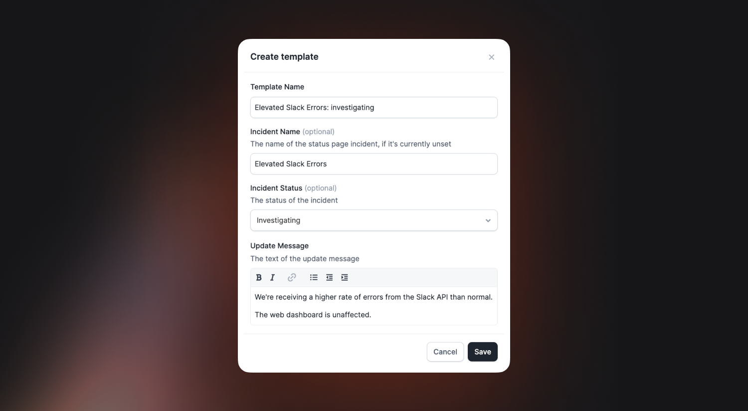 Each update template can include an incident name, status and message content, which will be pre-filled so the responder can make small tweaks before publishing.