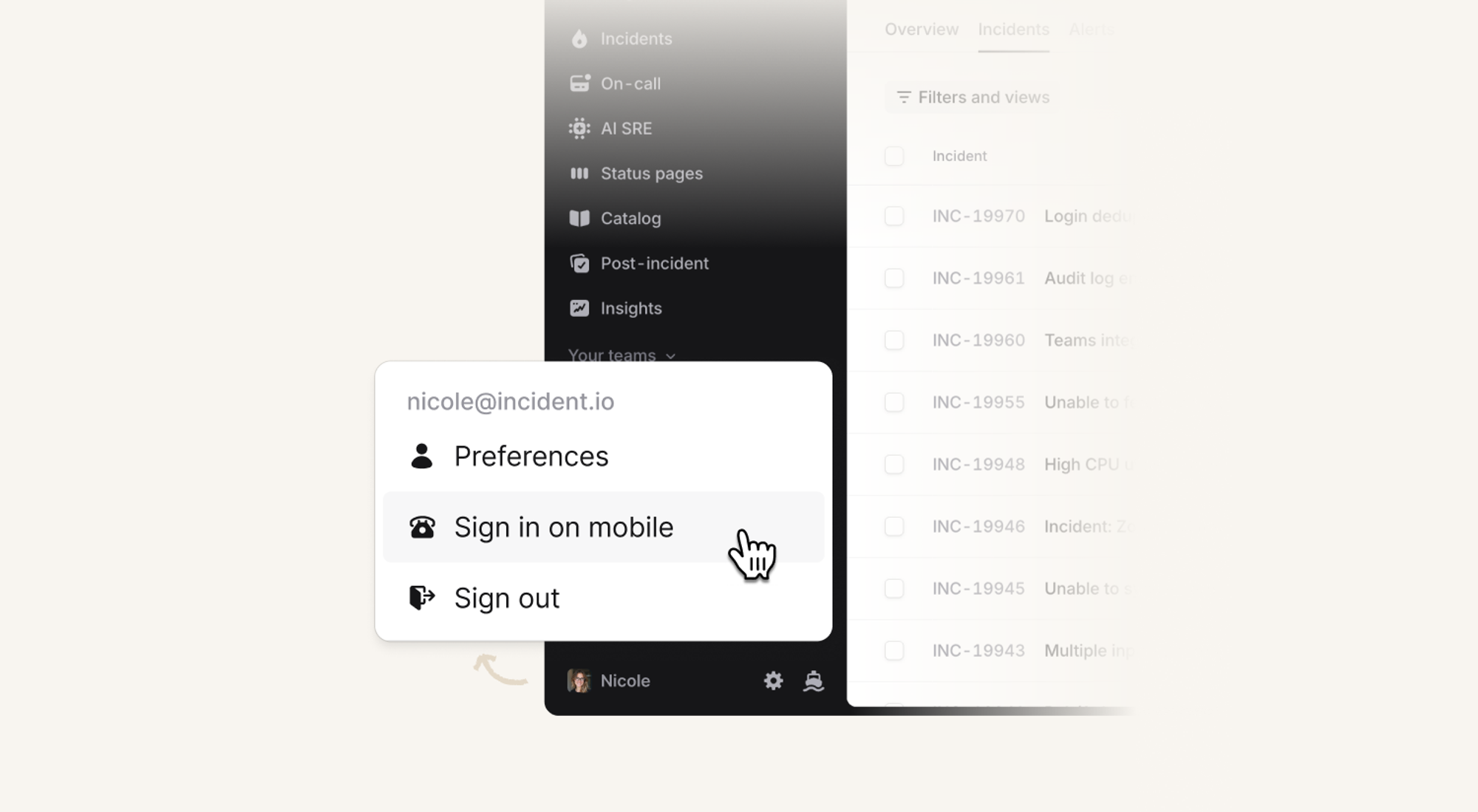 Customers can now generate a QR code in the dashboard that logs them in to the mobile app automatically. This means you can sign in to our app without being signed in to Slack or Microsoft Teams. The link appears for all customers who have On-call enabled, either when you click your own name in the bottom-left, or searching for "mobile" in the cmd+k menu.