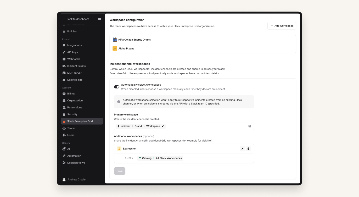 This is powered by Catalog, so organizations can model the relationship between, for example, teams and Slack workspaces, and then have the workspaces be determined from the incident's affected teams. We even update the workspaces the channel is in if the incident data changes!
