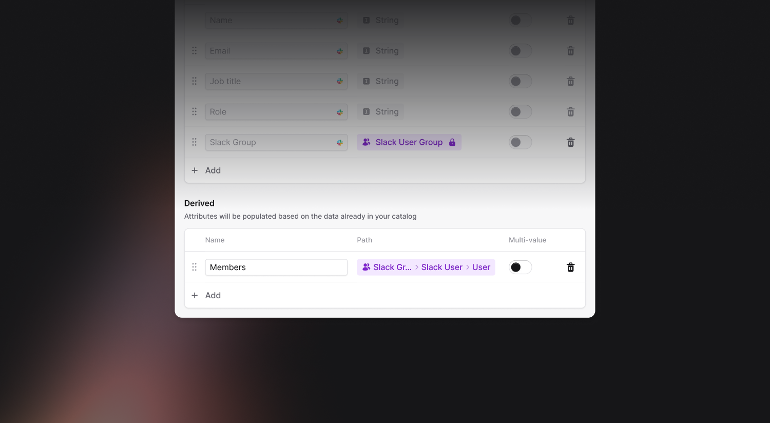 An example of this is in the screenshot above, where the Members attribute is derived from members of the Slack User Group. When you set the Slack User Group on a team, we’ll automatically figure out which people are on that team based on who’s in the group. And whenever who’s in that group changes, we’ll reflect that change in the Members attribute on the team.