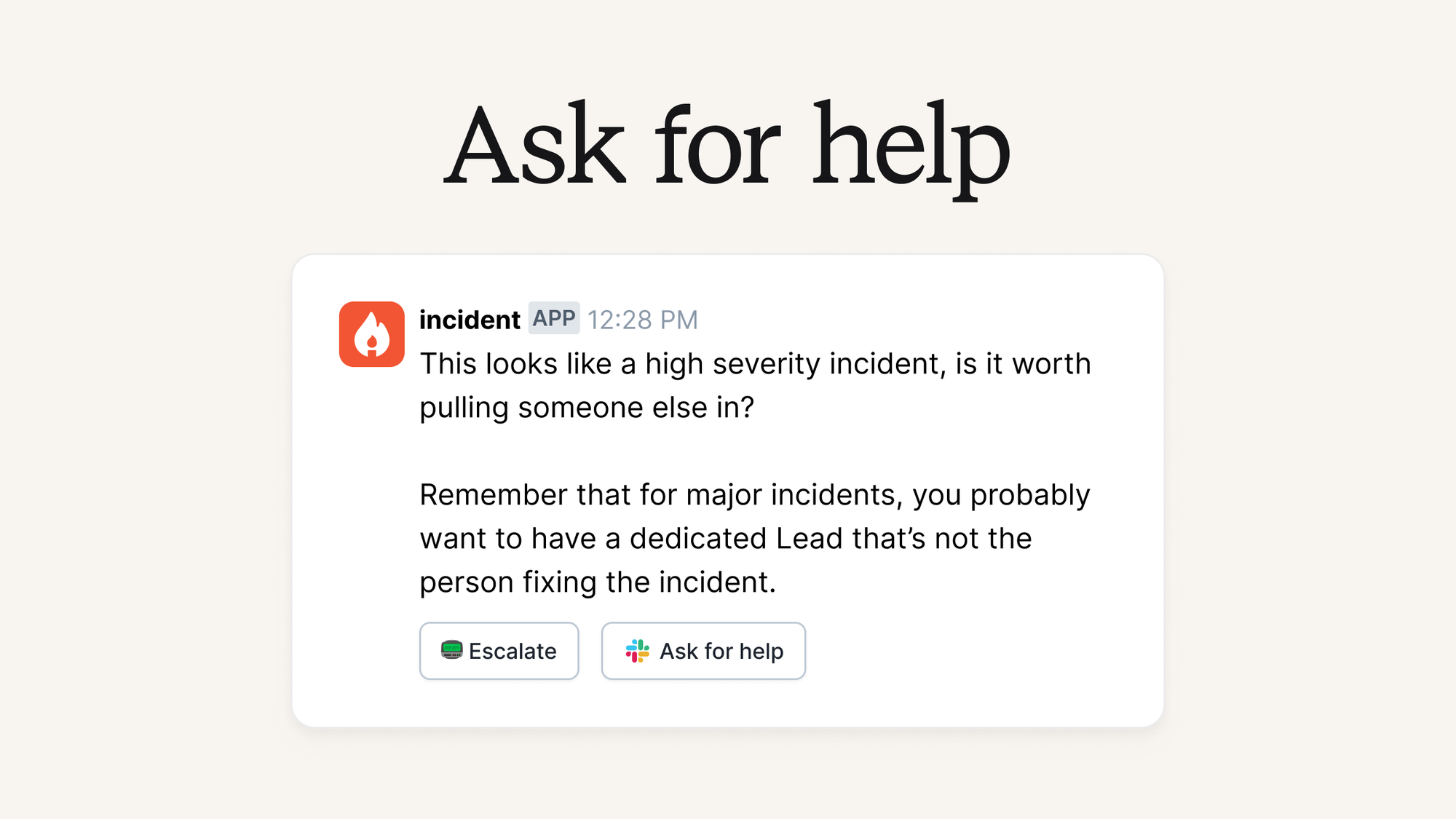 We've added a new nudge type, 'escalate', which will suggest that someone escalates or asks for help in Slack. For example, this can be used if there is a major incident with only one active participant.