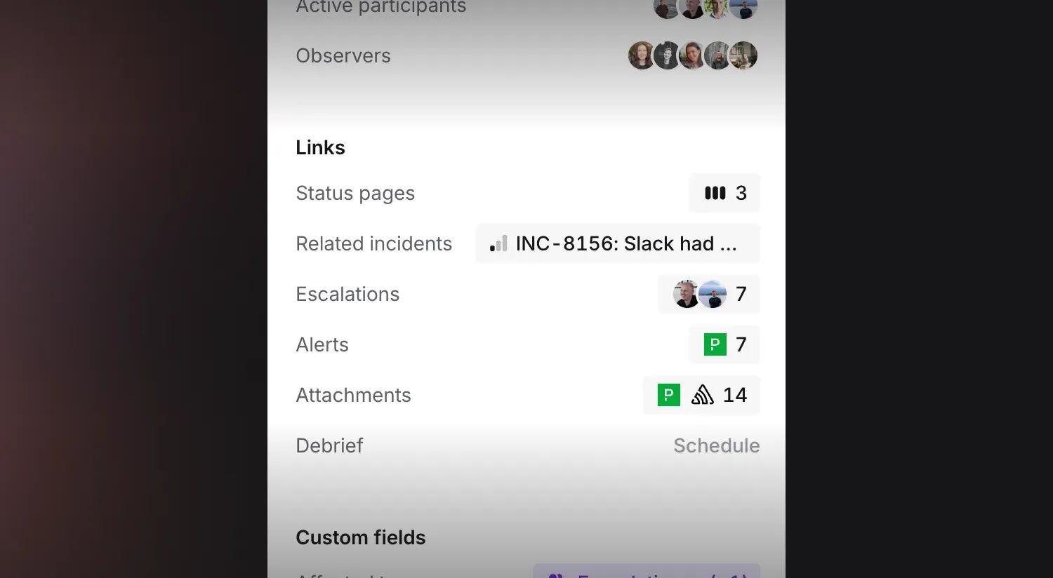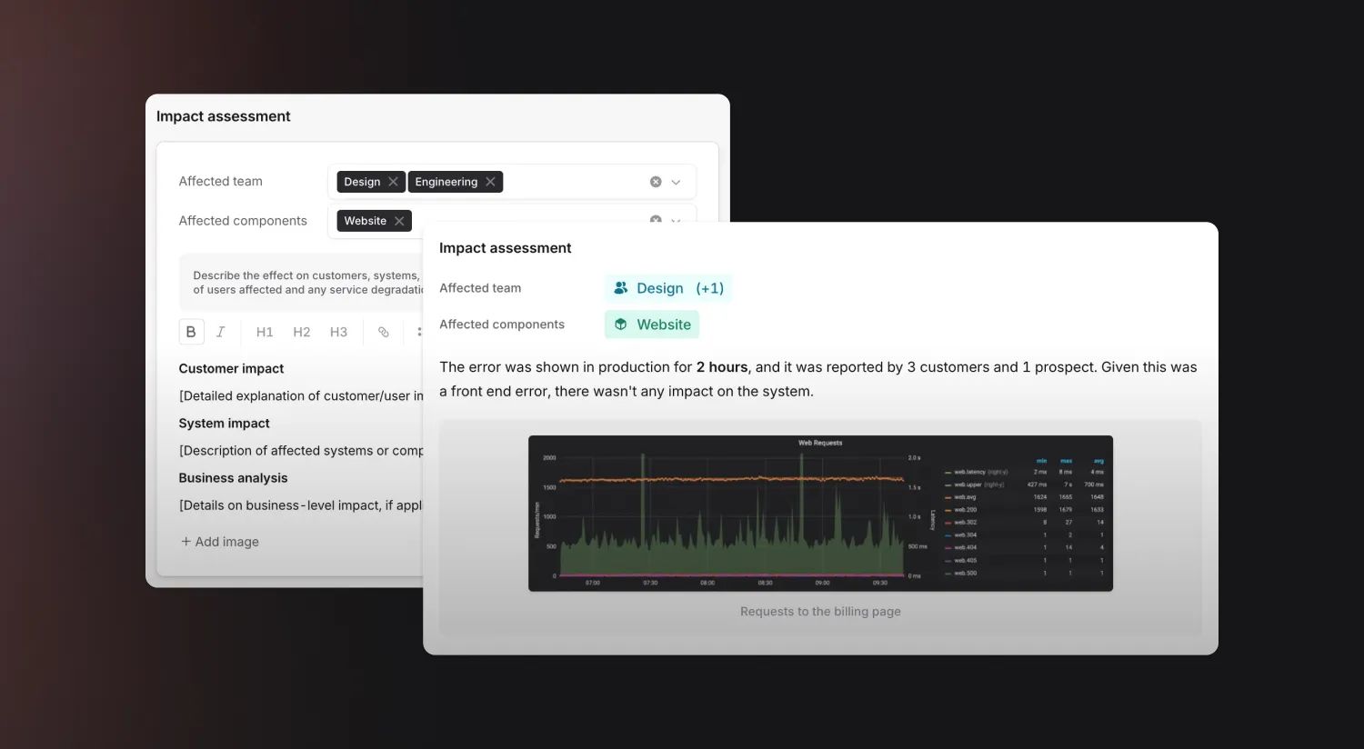 They get help text to guide them, the ability to quickly attach and ensure relevant custom fields are up to date and the option to add images as supplementary evidence - especially helpful for preserving charts from an observability tool.