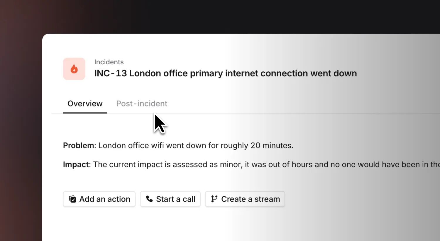 We’ll now also highlight things you might want to do in order to get that incident resolved e.g. add an action, start a call, or create a stream.