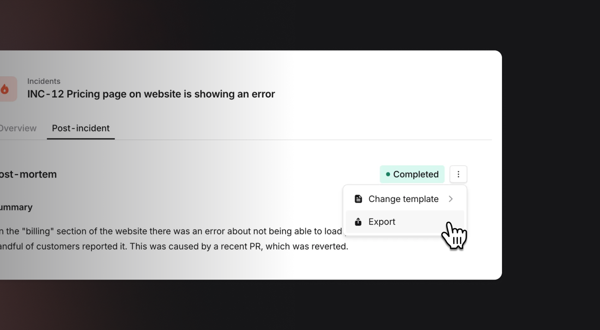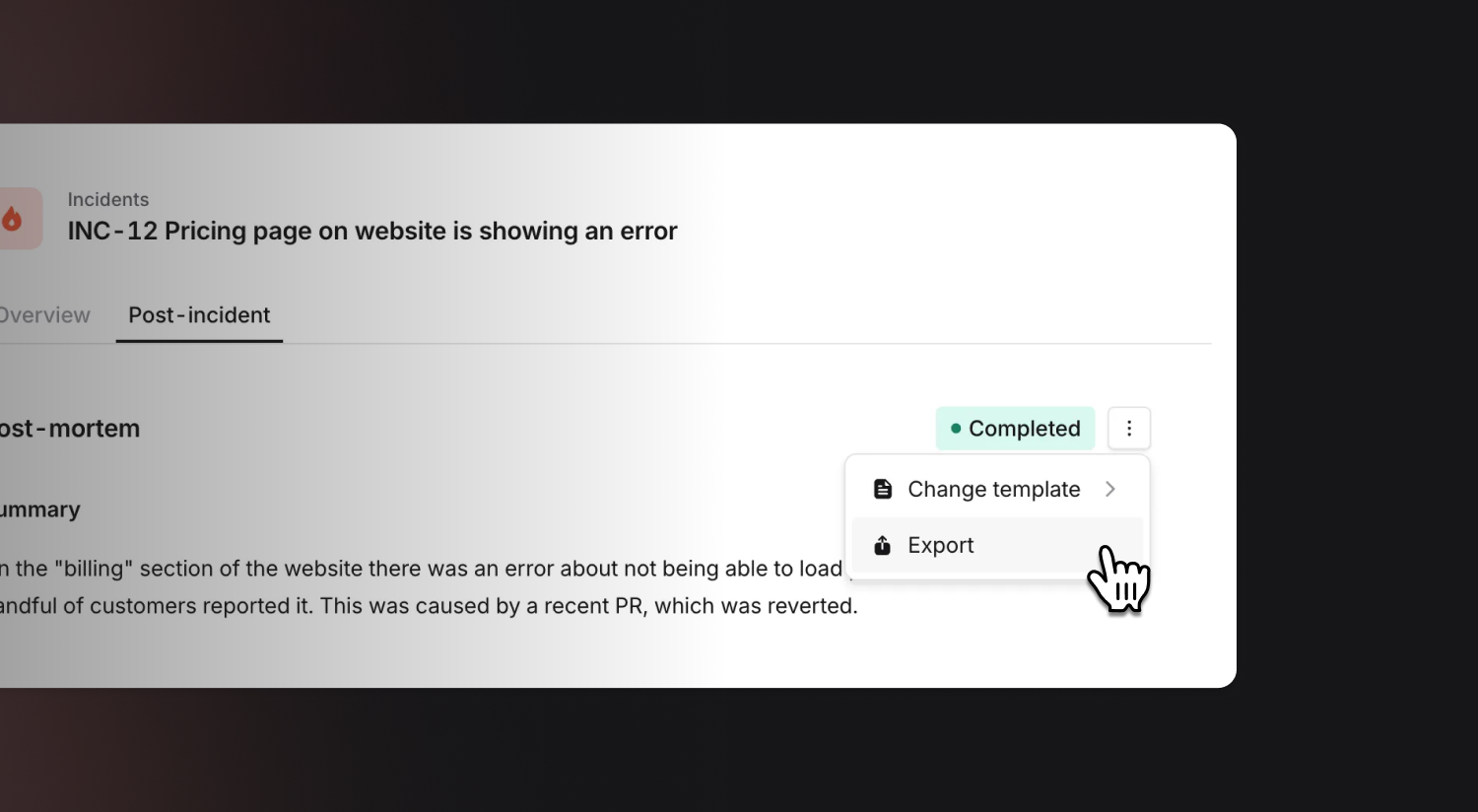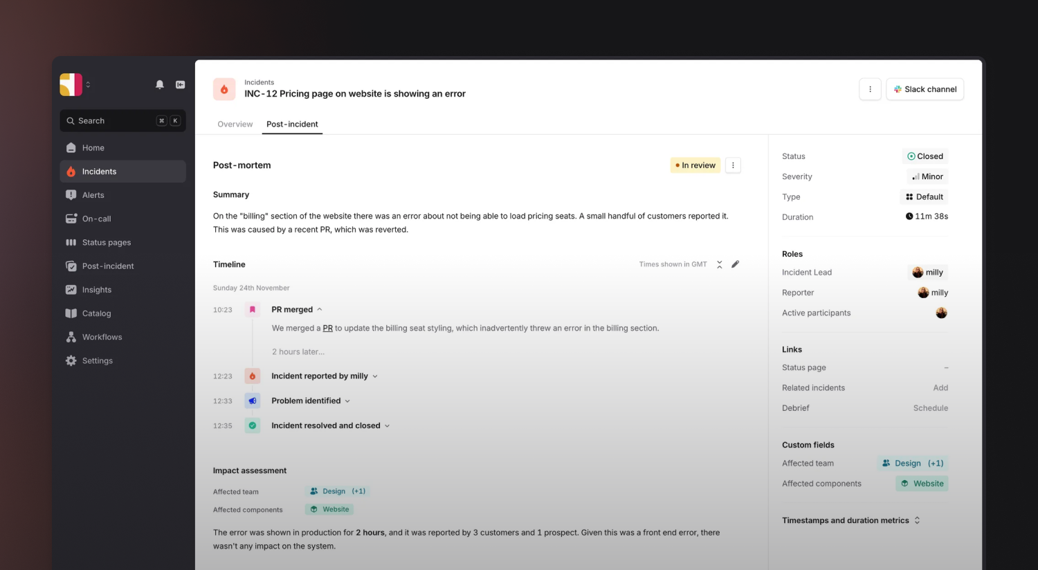 One of the things we’ve heard repeatedly is that writing post-mortems often feels harder and more heavyweight than it needs to be. Writing a comprehensive post-mortem in an external system can feel like overkill when a quick and easy writeup would do the trick, which means many incidents get a written summary, but not much else.