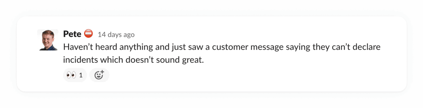 These teams are already fielding loads of requests from customers: bug fixes, feature requests and so on. Instead of chucking these into an issue tracker, like Jira or Linear, and hoping someone gets to it eventually, they can just declare an incident instead.